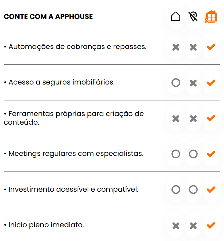 • Estrutura enxuta: A AppHouse© possui uma estrutura mais enxuta do que as imobiliárias tradicionais, o que se traduz em custos menores para os associados.